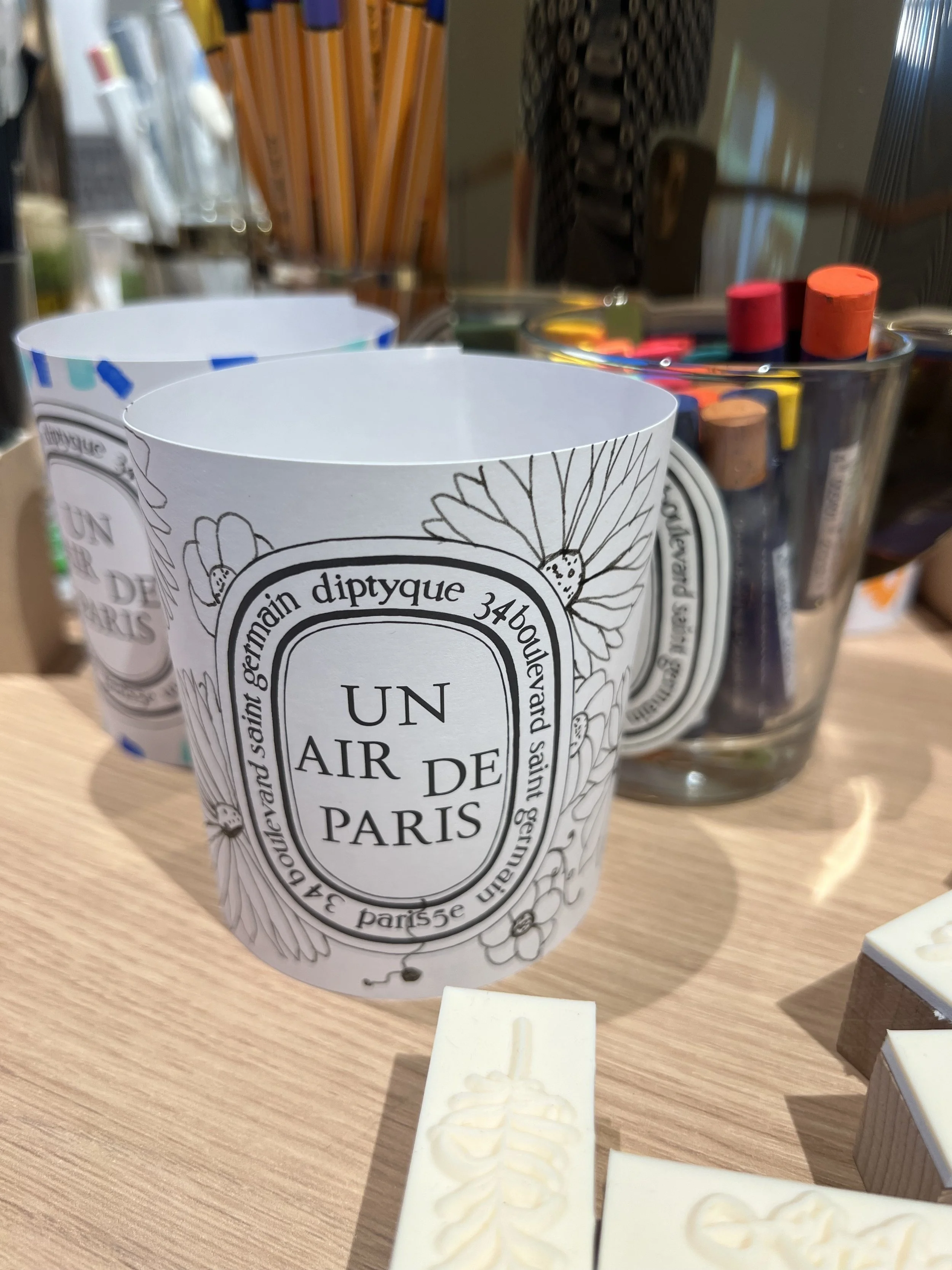 project: participants were invited to personalise their own paper covers for DIPTYQUE candles using a variety of creative tools, including markers, original stamps, and coloured pencils. Sample pattern references were also provided to inspire their designs. The activity reflected DIPTYQUE’s brand DNA—deeply rooted in art and illustration.