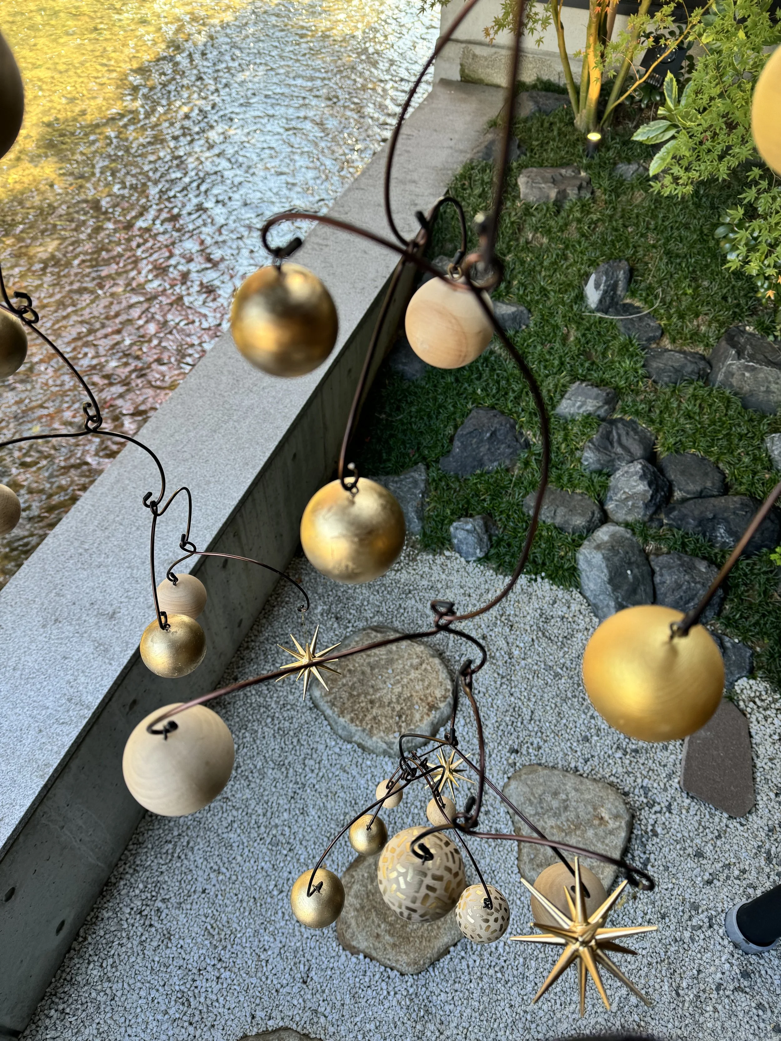 project: art dierction and design for Christmas installation for The Shinmonzen luxury boutique hotel in Kyoto. The concept drew inspiration from Kyoto’s traditional crafts and ikebana, reinterpreted through personal approach to festive decoration. Twelve Christmas trees were adorned with long, thin bamboo strips in natural and matte gold tones, referencing both the elegance of Japanese craftsmanship and the spirit of the season. On the hotel’s terrace, a mobile installation of wooden spheres in natural finishes and matte gold offered a contemporary nod to classic Christmas ornaments.